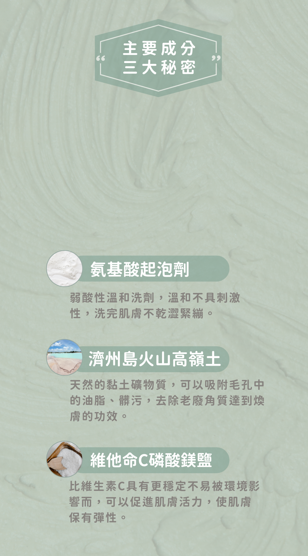 • 去離子水、氨基酸起泡劑、保濕劑、璜酸起泡劑、氨基璜酸起泡劑、高領土、保濕劑、保濕劑、保濕劑、覆脂劑、濟州島火山高領土、覆脂劑、保濕劑、水處理劑、維他命C磷酸鎂鹽、抗氧化劑、氨基酸.
