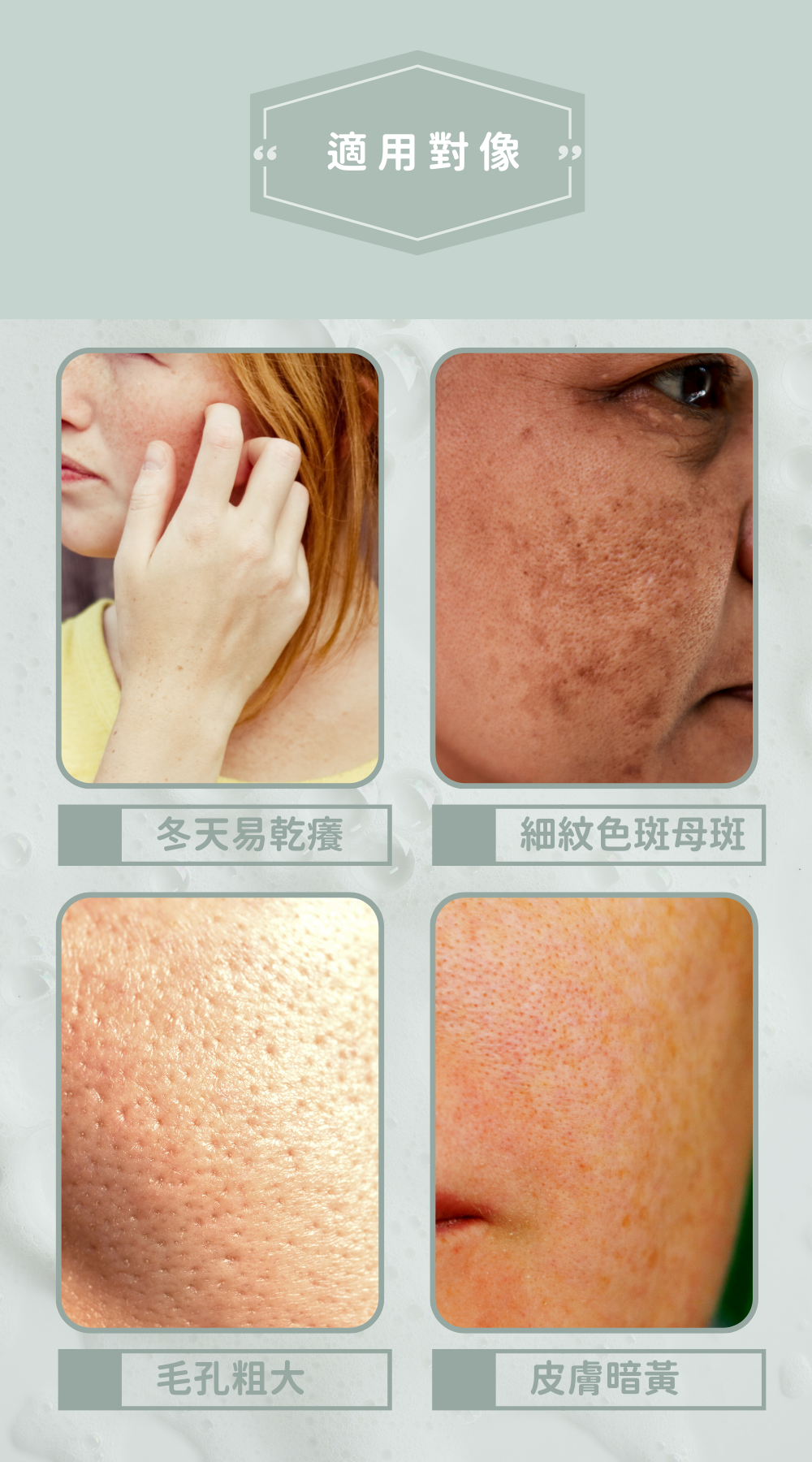 • 因個人膚質膚況、敏度與過敏源均不同,使用前,請先於耳際或肌膚局部測試數日。